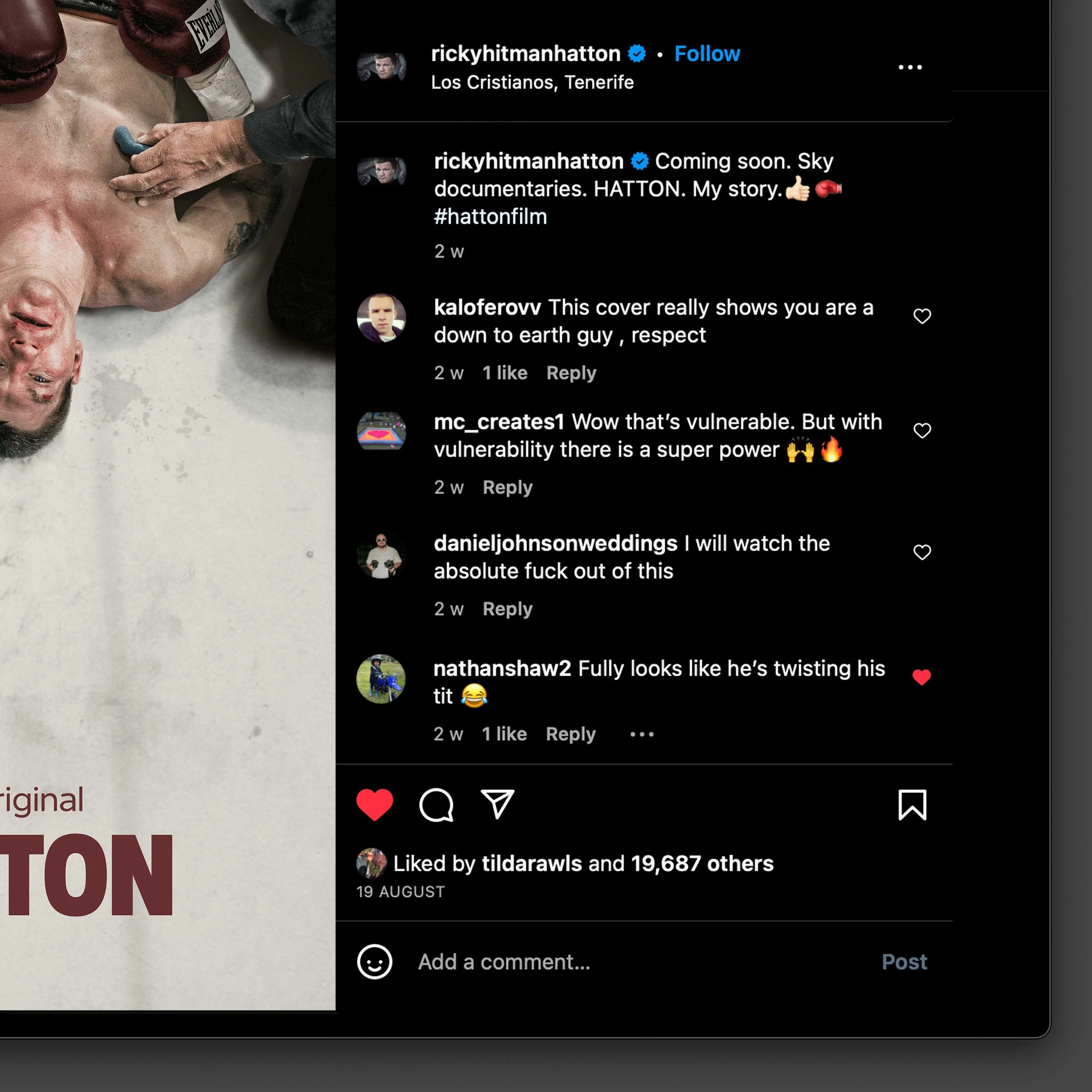 A documentary following the highs and lows of the career of legendary British boxer Ricky Hatton and his battle with mental health.